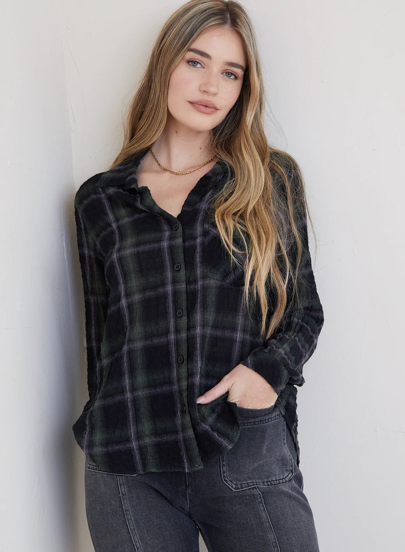This Pocket Button Down in Garden Plaid features a crinkly design, a collar, front buttons, one chest patch pocket, long sleeves, and hi-low style. This style is ideal for year round weather since it's super lightweight and versatile. Wear this shirt tied up in a knot or as is. Either way it will become a staple in your closet! Made with luxuriously soft and eco-friendly.