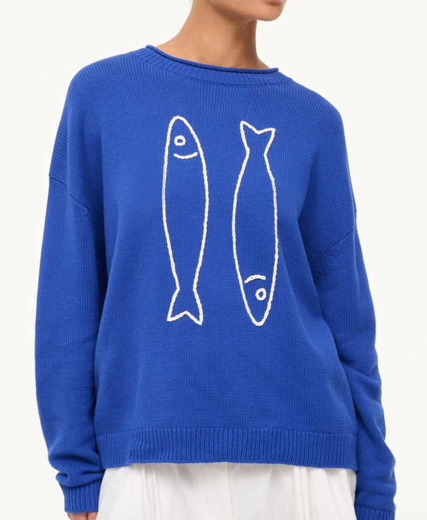 The Giada Sweater is a roomy crewneck sweater with our seasonal pop sardines embroidery at the front. This style is available in a cotton blend for a lightweight Summer sweater.