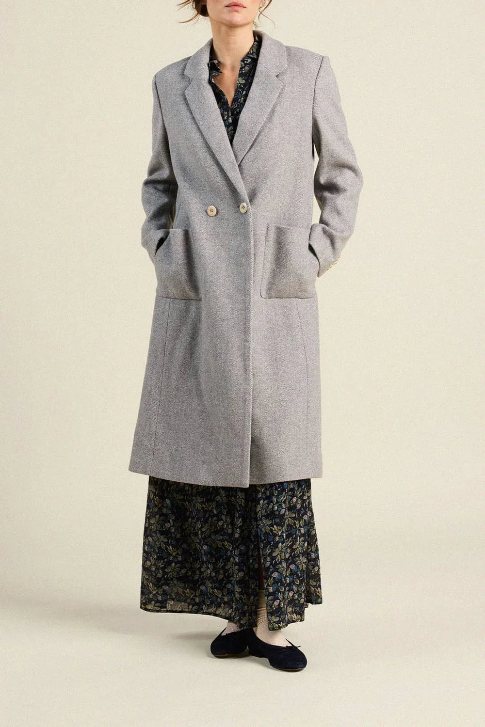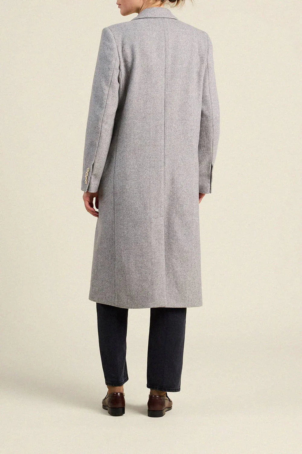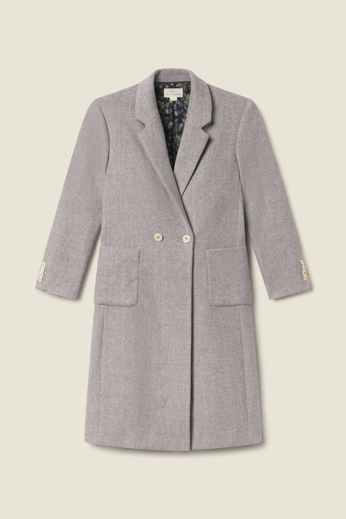 The Lars Coat is inspired by our mothers' timeless camel overcoats, is a classic wool design tailored with petersham ribbon trim and a vintage printed liner. This double-breasted coat finishes at mid-calf with long buttoned sleeves, a notched lapel, and 2-way front hip pockets for hand warmth and additional storage. Shown here in Grey and made from our soft wool.