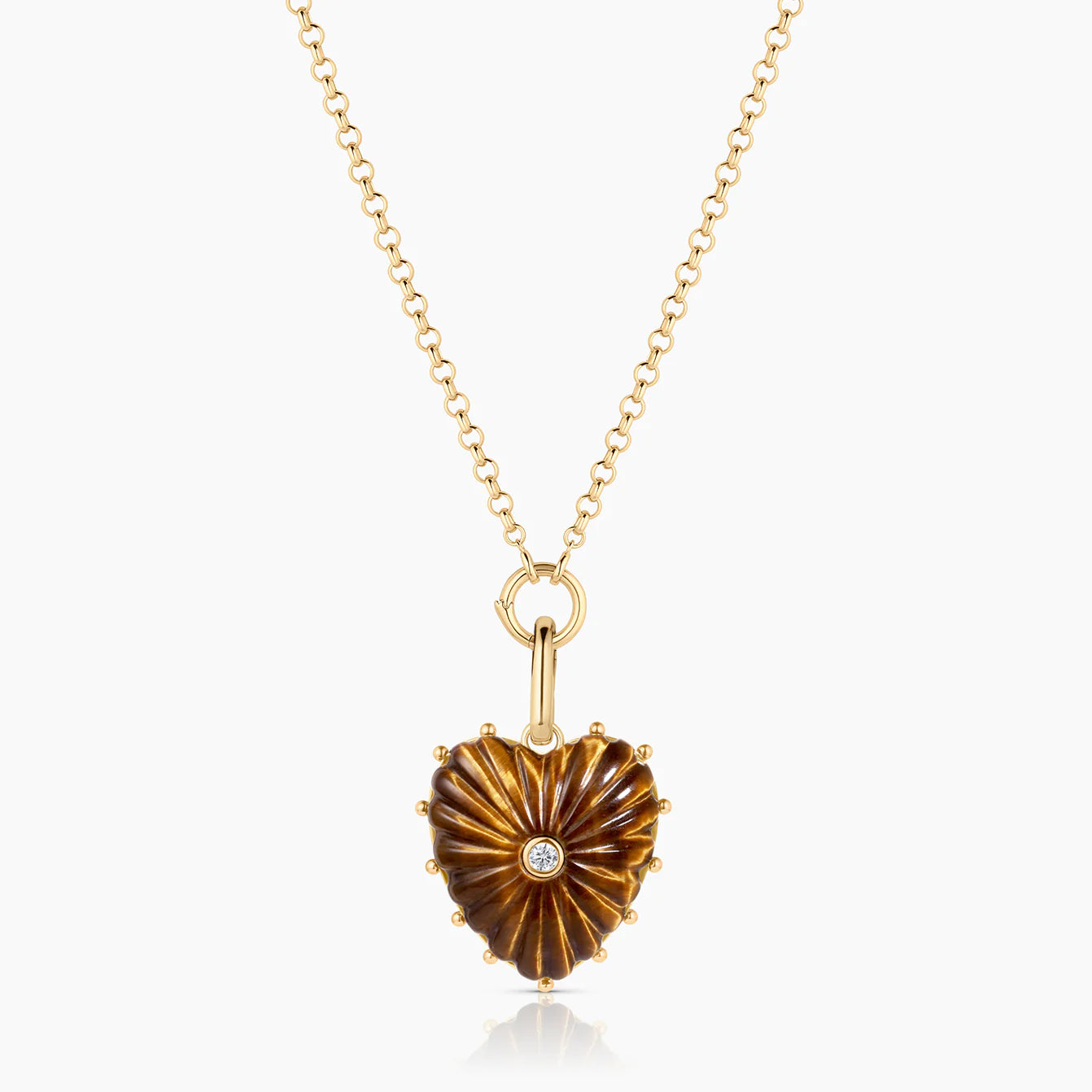 Our Malene heart charm in luxe tiger's eye—hand-carved stone, cubic zirconia, and high-shine gold on a large round bail for versatility. Everything you want and need to make a statement.