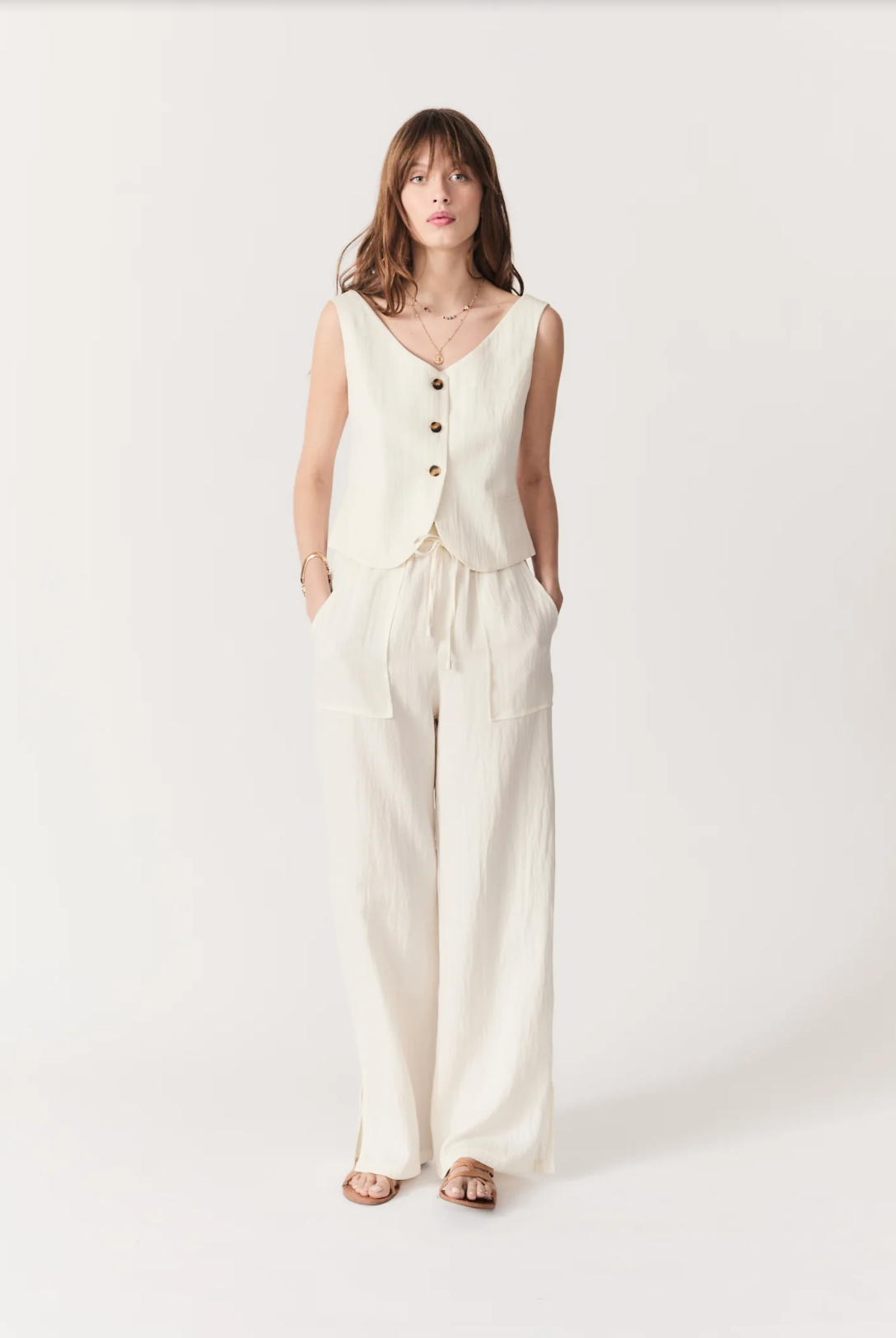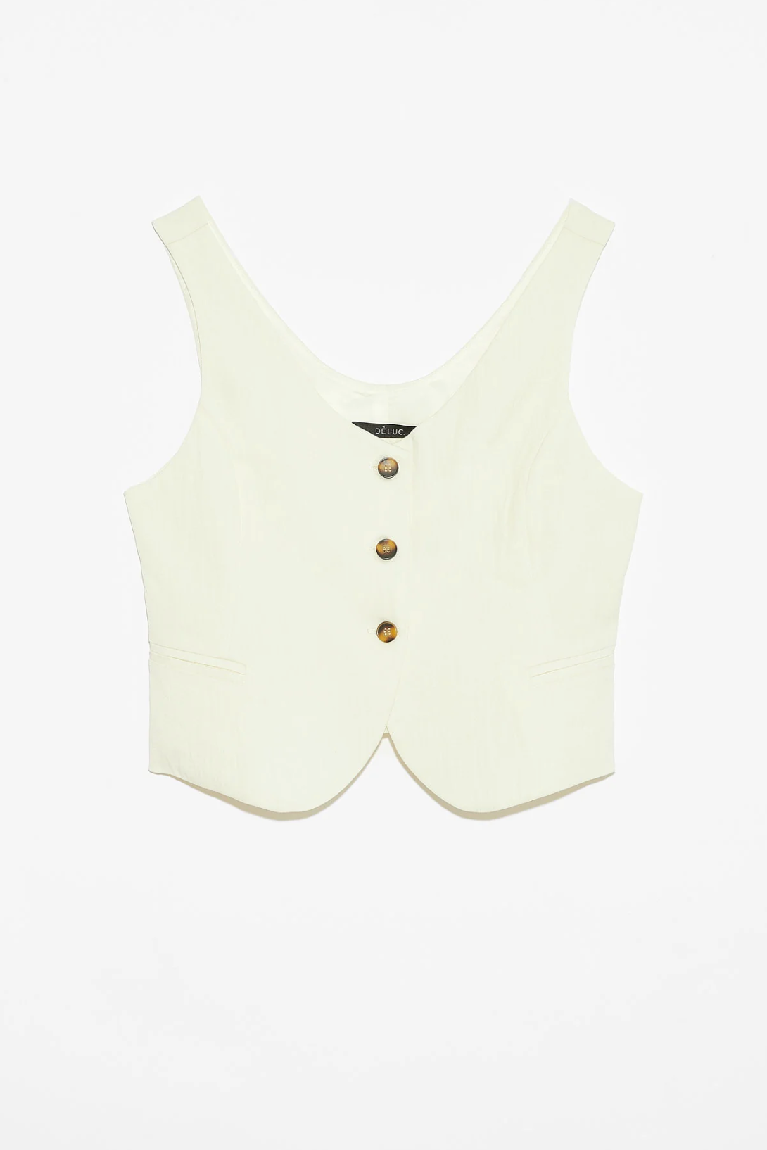 Tencel blend vest with U neckline. Fake welt pockets on front. Fully lined garment. Front marbled buttons for closure on front