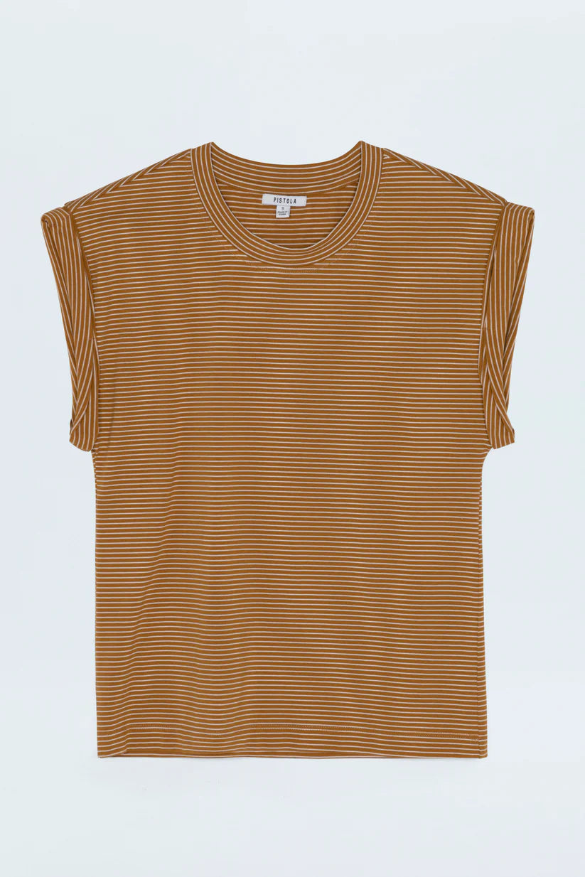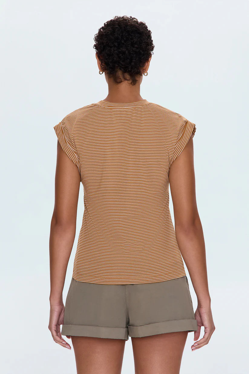Meet the Olivia Twisted Tee, the ultimate basic with a playful twist. This isn't just any striped tee; it's designed to be your go-to, thanks to its easy stripe pattern and ultra-flattering cap sleeves. Made from super soft cotton, you'll want to reach for this tee every single day. It pairs perfectly with all your essential bottoms, making it an indispensable addition to your wardrobe