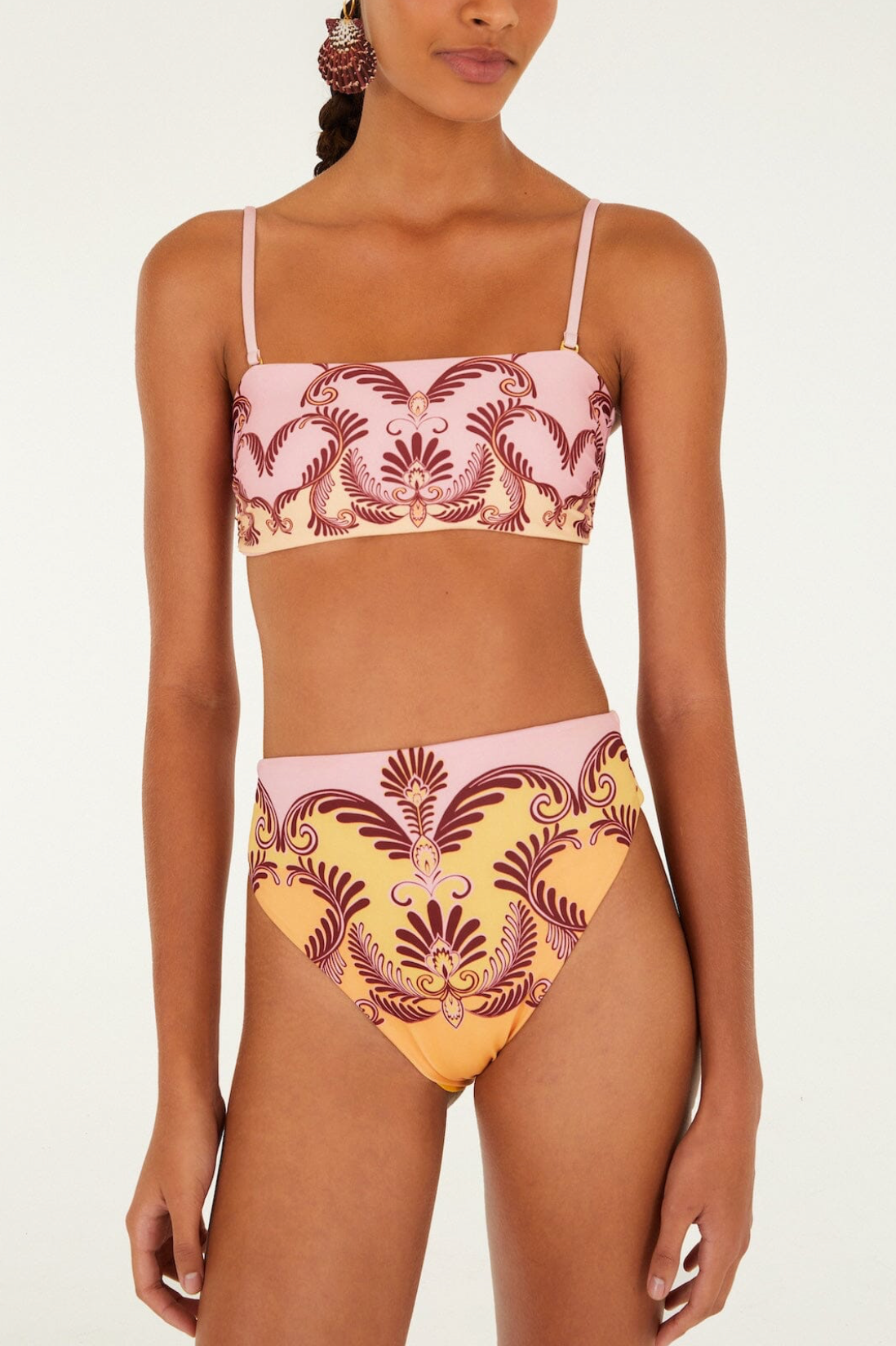 Embrace the sun with the Soft Yellow Arabesc Hot Pants Bikini Bottom from FARM Rio. Crafted in a vibrant, warm yellow, this playful piece features a flattering high-cut silhouette that elongates the legs while offering comfortable coverage. The delicate arabesc pattern adds a touch of whimsical charm, making every movement feel light and joyful. Perfect for those carefree beach days, it pairs effortlessly with your favorite tropical vibes.