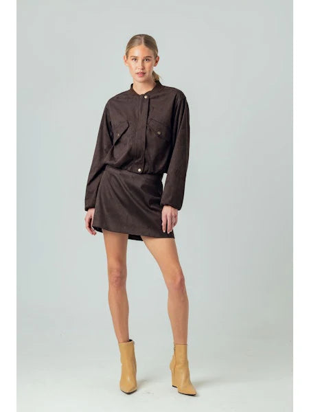 A suede bubble jacket designed with both style and function. Featuring double front pockets, side pockets, and a zip-and-snap closure, it’s cut with a cropped silhouette that sits perfectly at the waist of the Mina Skirt.