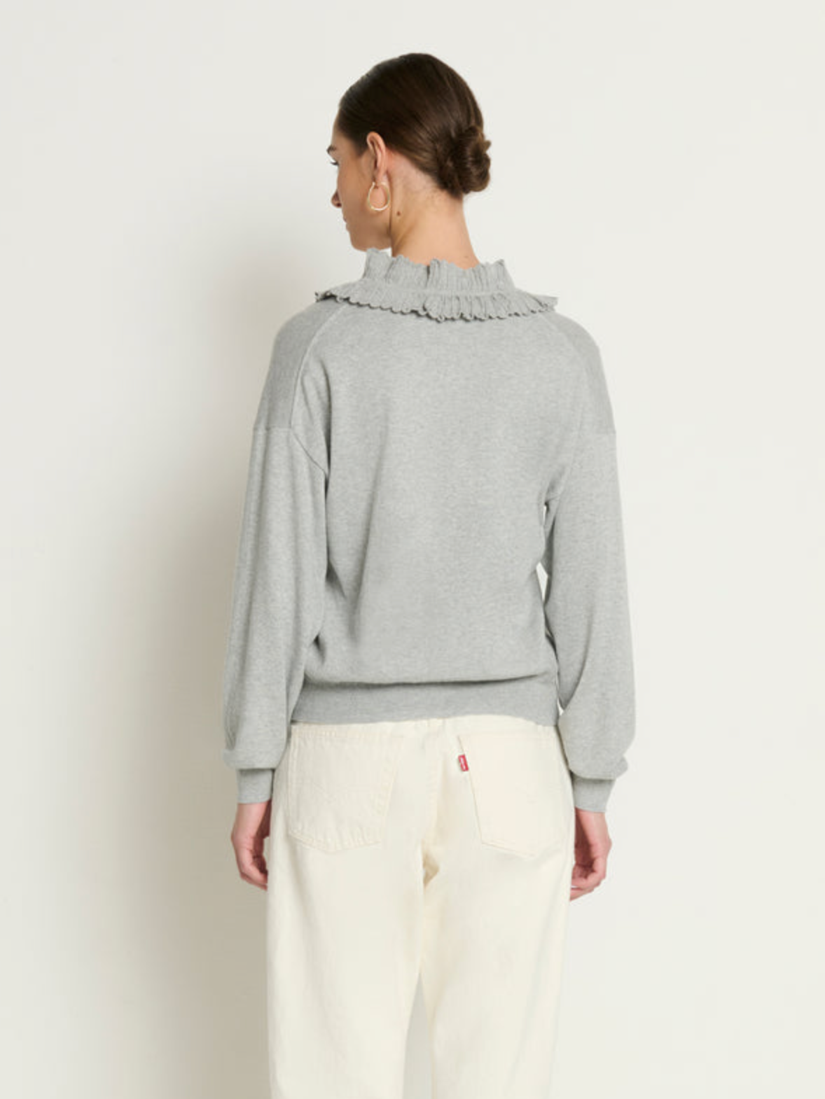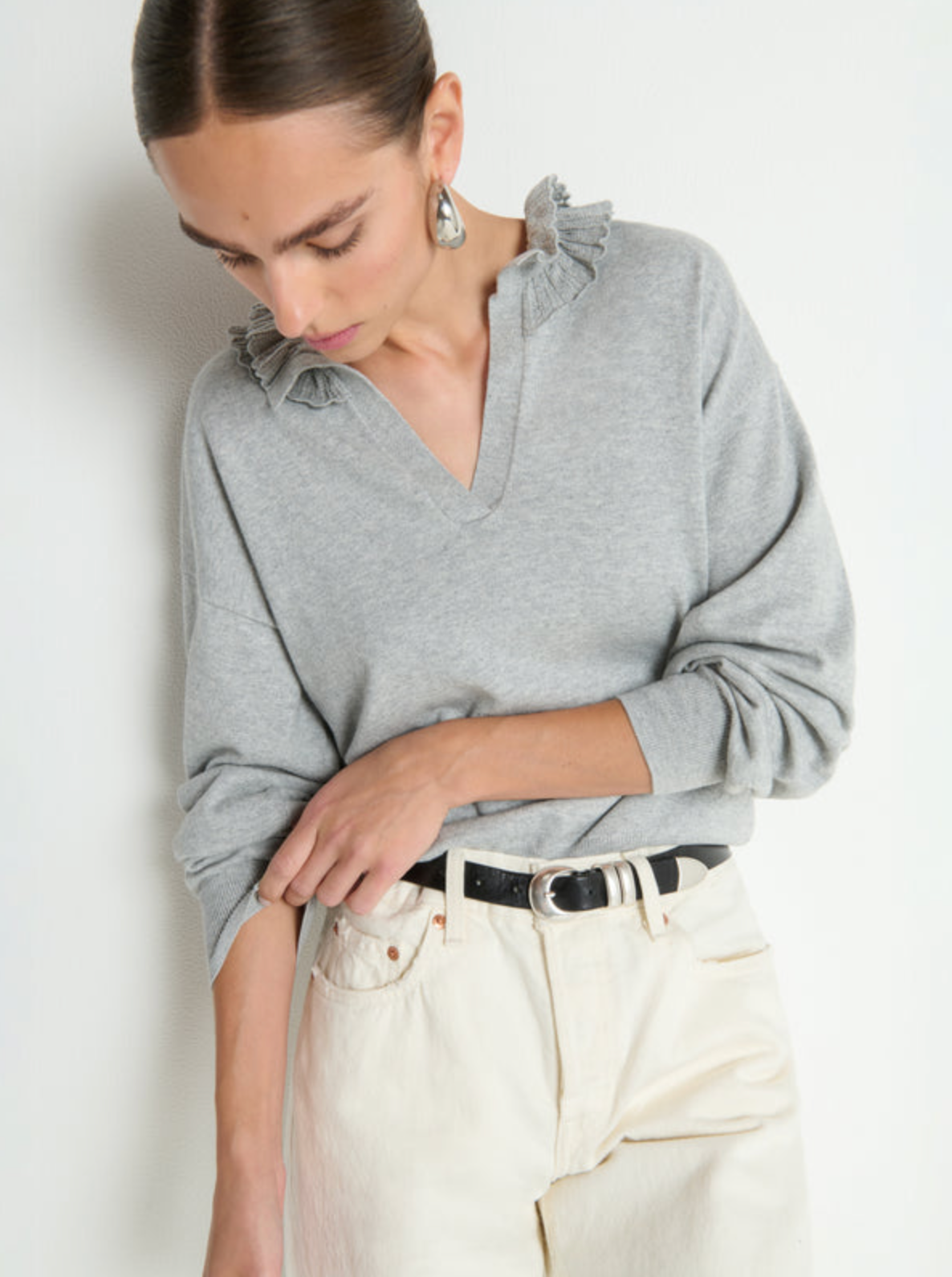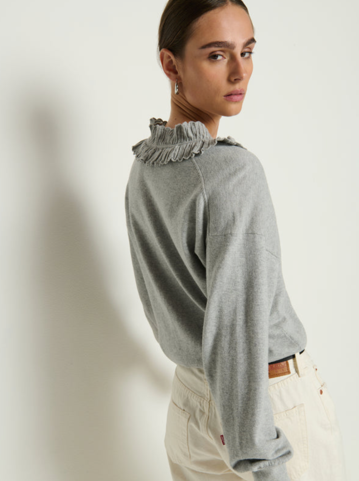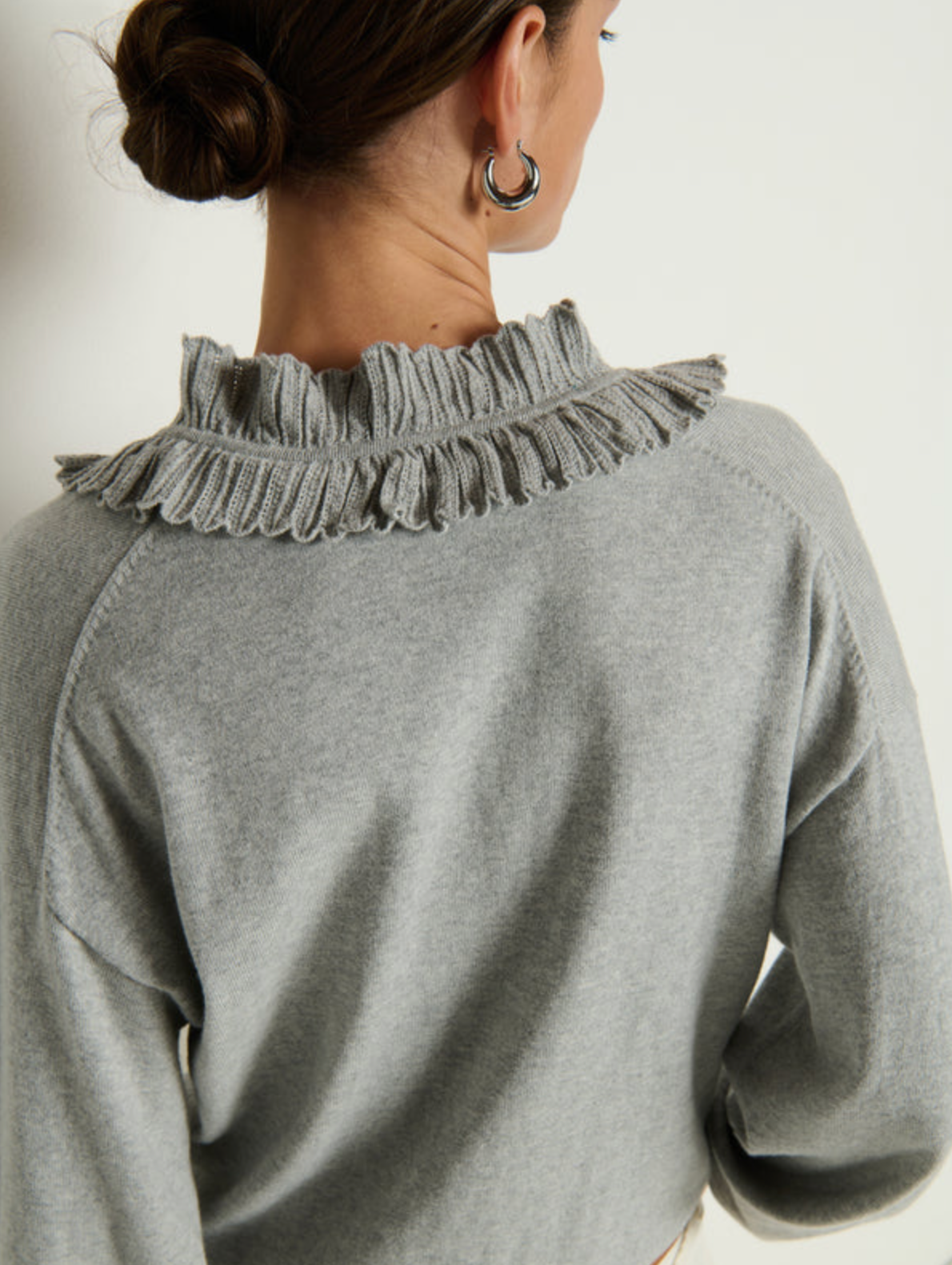 Everyday, with a little extra. A relaxed sweater in a soft cashmere-cotton blend, with a ruffled collar adds a refined feel.