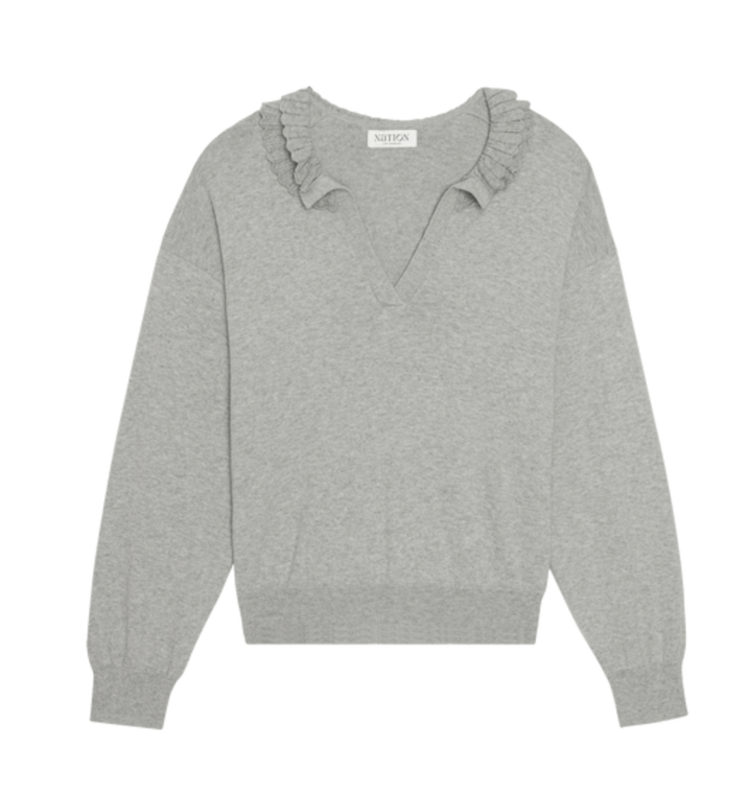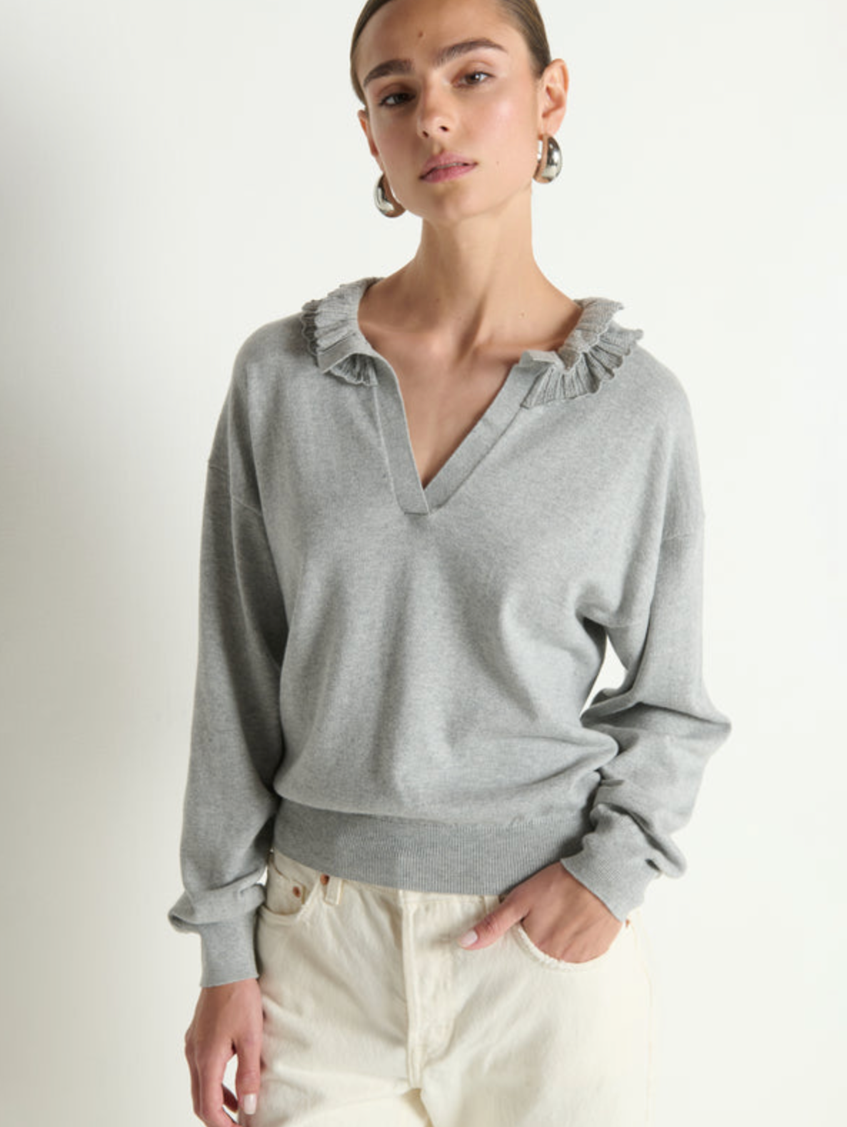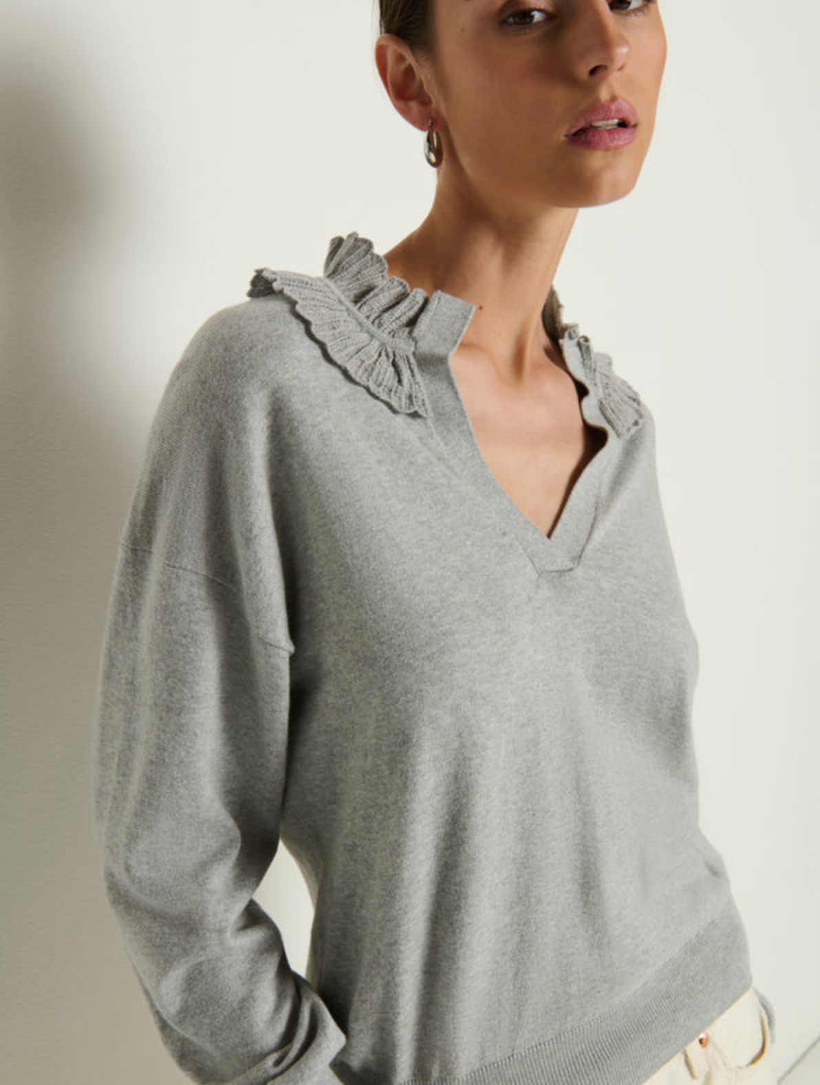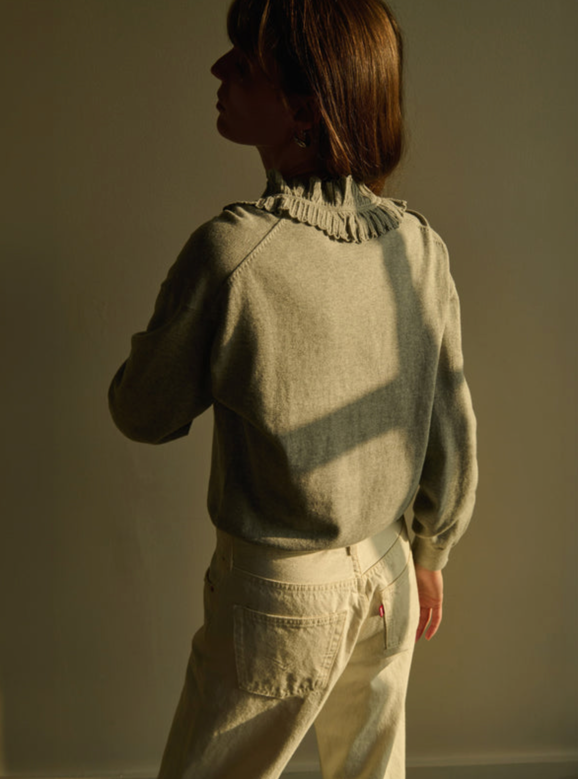 Everyday, with a little extra. A relaxed sweater in a soft cashmere-cotton blend, with a ruffled collar adds a refined feel.